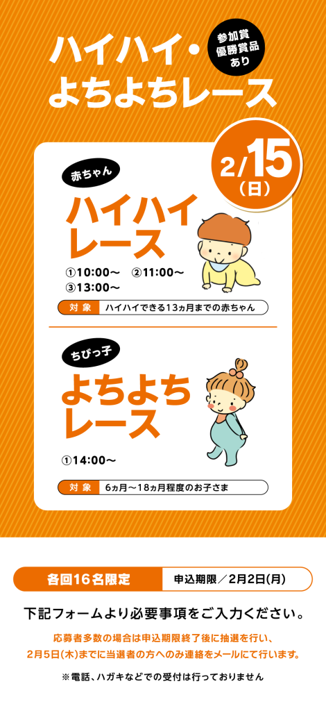 - 申込受付後、「KTNハウジングギャラリー ハイハイ・よちよちレース 受付完了」というタイトルでメールを自動送信しております。メールの確認が出来ない場合、「迷惑メール」に分類されていないか、ご確認くださいますようお願いいたします。