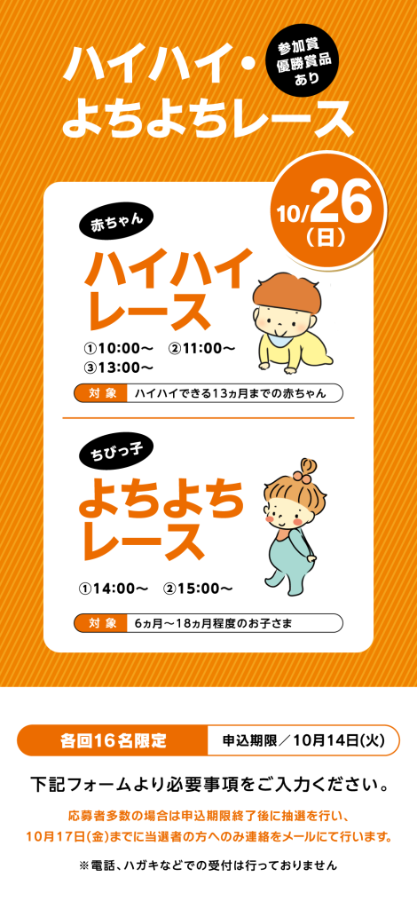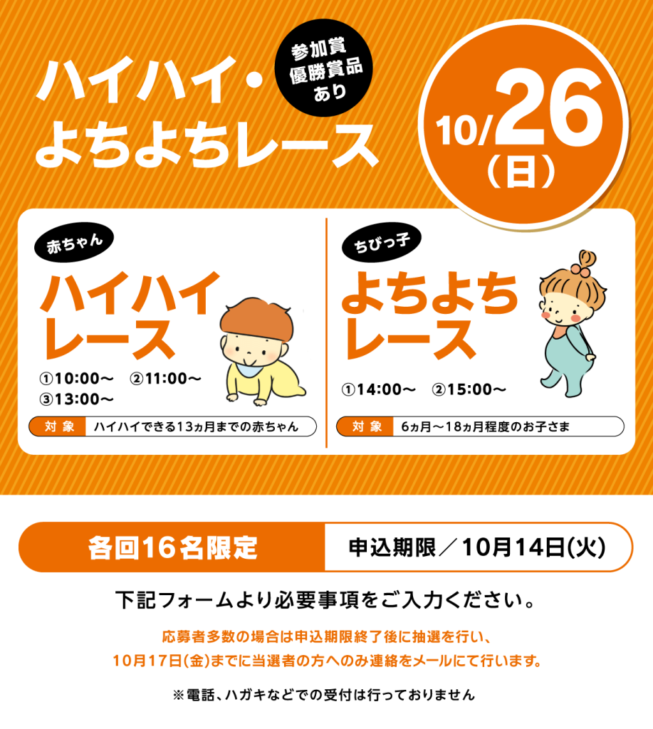 - 申込受付後、「KTNハウジングギャラリー ハイハイ・よちよちレース 受付完了」というタイトルでメールを自動送信しております。メールの確認が出来ない場合、「迷惑メール」に分類されていないか、ご確認くださいますようお願いいたします。